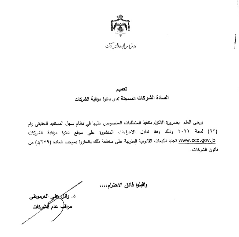 يرجى العلم بضرورة الالتزام بتنفيذ المتطلبات المنصوص عليها في نظام سجل المستفيد الحقيقي رقم 62 لسنة 2022 وذلك وفقاً لدليل الاجراءات المنشوره على موقع دائرة مراقبة الشركات www.ccd.gov.jo تجنباً للتبعات القانونيه المترتبه على مخالفة ذلك والمقرره بموجب الماده (279/د)من قانون الشركات.